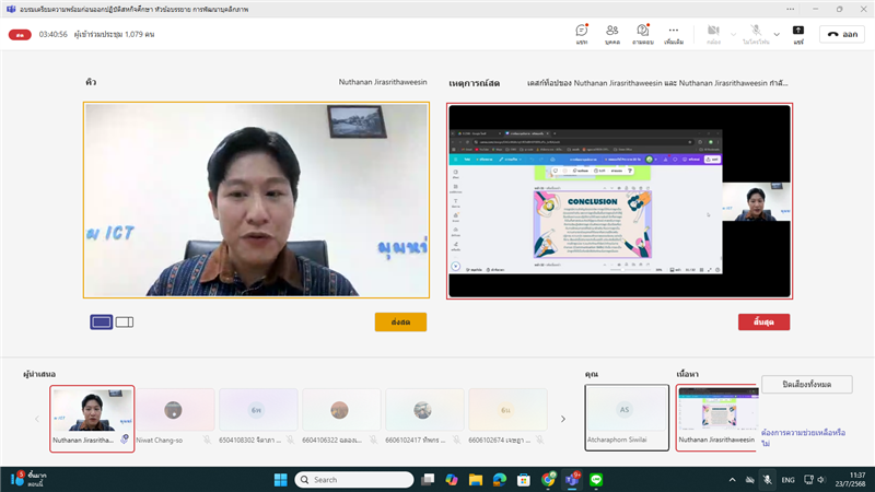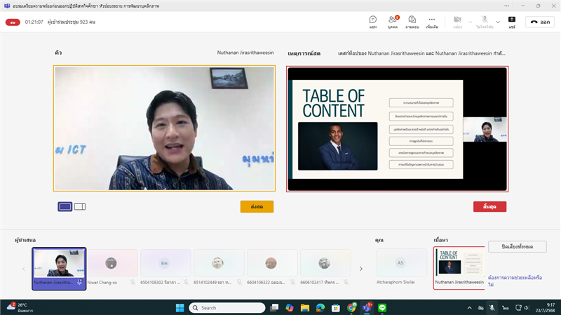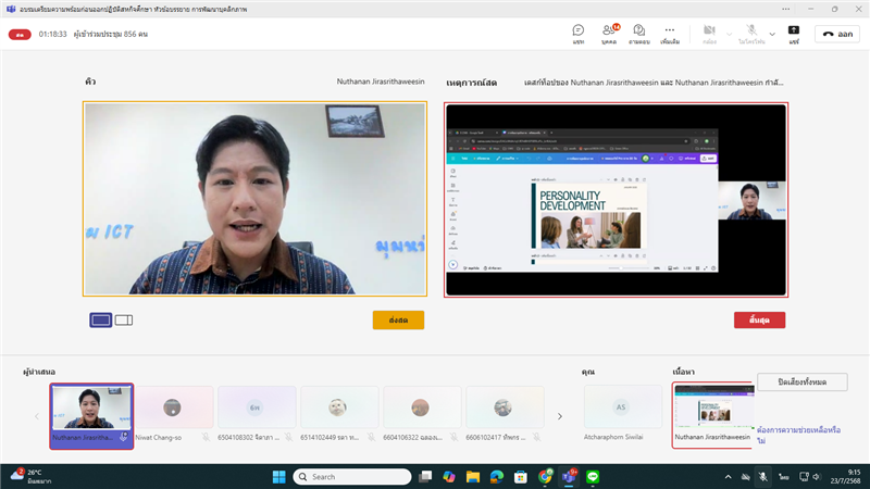 วันพุธที่ 23 กรกฎาคม 2568 เวลา 09.00 - 12.00 น. ฝ่ายสหกิจศึกษาและพัฒนาอาชีพ สำนักบริหารและพัฒนาวิชาการ ได้ทำการอบรมเตรียมความพร้อมก่อนออกปฏิบัติสหกิจศึกษา ประจำปีการศึกษา 2567-2568 ภาคการศึกษาที่ 1 ประจำปีการศึกษา 2568 โดยการอบรมใช้ Microsoft Teams (การถ่ายทอดสด) ให้แก่นักศึกษา โดยจัดการอบรมบรรยายหัวข้อ การพัฒนาบุคลิกภาพโดย อาจารย์วรเมธ ชัยมงคล อาจารย์ประจำคณะบริหารธุรกิจและศิลปศาสตร์