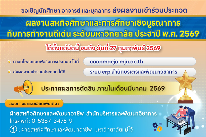 ขอเชิญนักศึกษา อาจารย์ และบุคลากร ส่งผลงานเข้าร่วมประกวดผลงานสหกิจศึกษาและการศึกษาเชิงบูรณาการ กับการทำงานดีเด่น ระดับมหาวิทยาลัย ประจำปี พ.ศ. 2569ได้ตั้งแต่บัดนี้ จนถึง วันศุกร์ที่ 27 กุมภาพันธ์ 2569ส่งผลงานเข้าร่วมประกวด ได้ที่ ระบบ erp สํานักบริหารและพัฒนาวิชาการ ประกาศผลการตัดสิน ภายในเดือนมีนาคม 2569สอบถามรายละเอียดเพิ่มเติม : ฝ่ายสหกิจศึกษาและพัฒนาอาชีพ สํานักบริหารและพัฒนาวิชาการโทรศัพท์ : 0 5387 3476-9f  (Facebook Page)  : ฝ่ายสหกิจศึกษาและพัฒนาอาชีพ มหาวิทยาลัยแม่โจ้ ดาวน์โหลดแบบฟอร์มการประกวด เกณฑ์การพิจารณาคัดเลือกและตัดสินผลงานสหกิจศึกษาและการศึกษาเชิงบูรณาการกับการทำงานดีเด่น ระดับมหาวิทยาลัย ประจำปี พ.ศ. 2569 (อ้างอิงตามเกณฑ์ระดับชาติ)ประเภทที่ 4 นักศึกษา CWIE ที่มีโครงงาน/ผลการปฏิบัติงานด้านวิทยาศาสตร์และเทคโนโลยีดีเด่นประเภทที่ 5 นักศึกษา CWIE ที่มีโครงงาน/ผลการปฏิบัติงานด้านสังคมศาสตร์ มนุษยศาสตร์และการจัดการดีเด่นประเภทที่ 6 นักศึกษา CWIE ที่มีโครงงาน/ผลการปฏิบัติงานด้านนวัตกรรมดีเด่นประเภทที่ 7 นักศึกษา CWIE นานาชาติดีเด่นประเภทที่ 8 คณาจารย์นิเทศ CWIE ดีเด่นประเภทที่ 9 ผู้นิเทศงาน CWIE ในสถานประกอบการดีเด่นประเภทที่ 11 ผู้ปฏิบัติการหลักสูตร CWIE ในสถานศึกษาดีเด่นประเภทที่ 12 ผู้ปฏิบัติการหลักสูตร CWIE ในสถานประกอบการดีเด่นประเภทที่ 13 สถานประกอบการขนาดใหญ่ ดำเนินการหลักสูตร CWIE ดีเด่นประเภทที่ 14 สถานประกอบการขนาดกลาง ดำเนินการหลักสูตร CWIE ดีเด่นประเภทที่ 15 สถานประกอบการขนาดเล็ก ดำเนินการหลักสูตร CWIE ดีเด่น