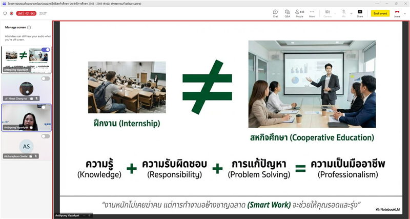 วันพุธที่ 25 กุมภาพันธ์ 2569 เวลา 13.00 - 16.00 น. ฝ่ายสหกิจศึกษาและพัฒนาอาชีพ สำนักบริหารและพัฒนาวิชาการ ได้ทำการอบรมเตรียมความพร้อมก่อนออกปฏิบัติสหกิจศึกษา ประจำปีการศึกษา 2568-2569 โดยการอบรมใช้ Microsoft Teams (การถ่ายทอดสด) ให้แก่นักศึกษาโดยจัดการอบรมบรรยาย หัวข้อทักษะการแก้ไขปัญหาเฉพาะ โดย อาจารย์ ว่าที่ร้อยตรีหญิง ดร.นัยนา โปธาวงค์ คณะเศรษฐศาสตร์ มหาวิทยาลัยแม่โจ้